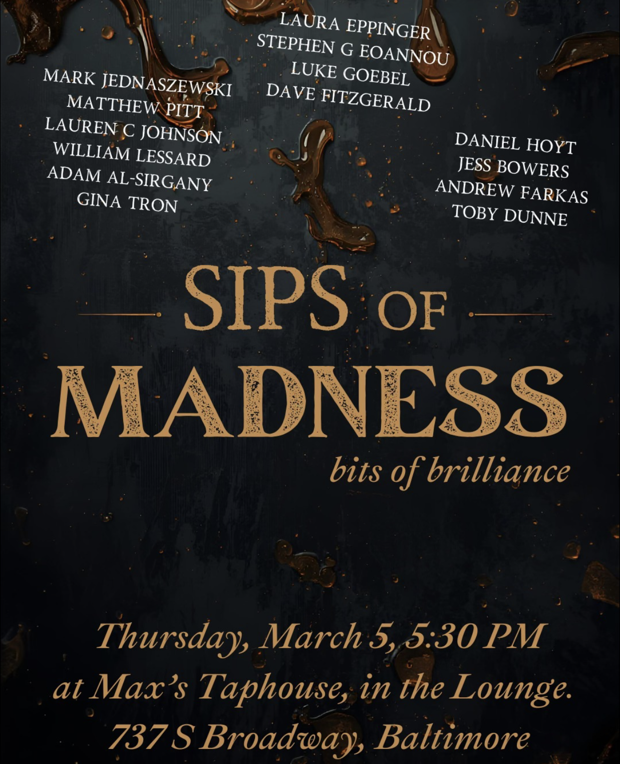Thursday night, 5:30 PM at Max’s Taphouse in Fells Point, I’m joining a fabulous lineup of writers for an AWP off-site reading that’s going to knock your socks off!