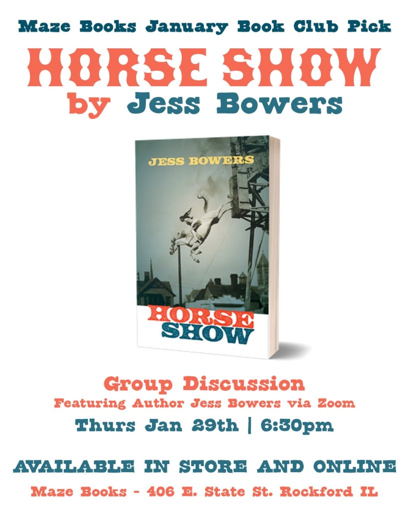 I’m thrilled to announce that the magical Maze Books in Rockford, Illinois has selected HORSE SHOW as their January 2026 book club pick!